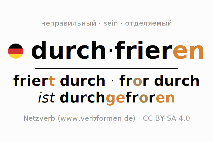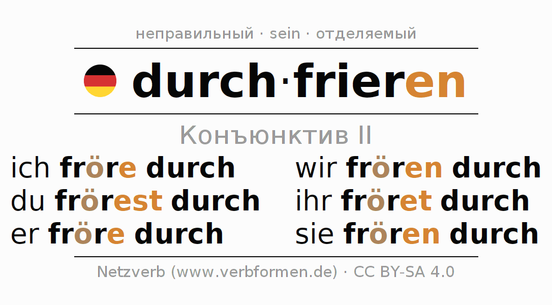Спряжение durchfrieren (замерзать, промерзать) в сослагательном наклонении II: ich fröre durch, du frörest durch, er fröre durch, wir frören durch, ihr fröret durch, sie frören durch