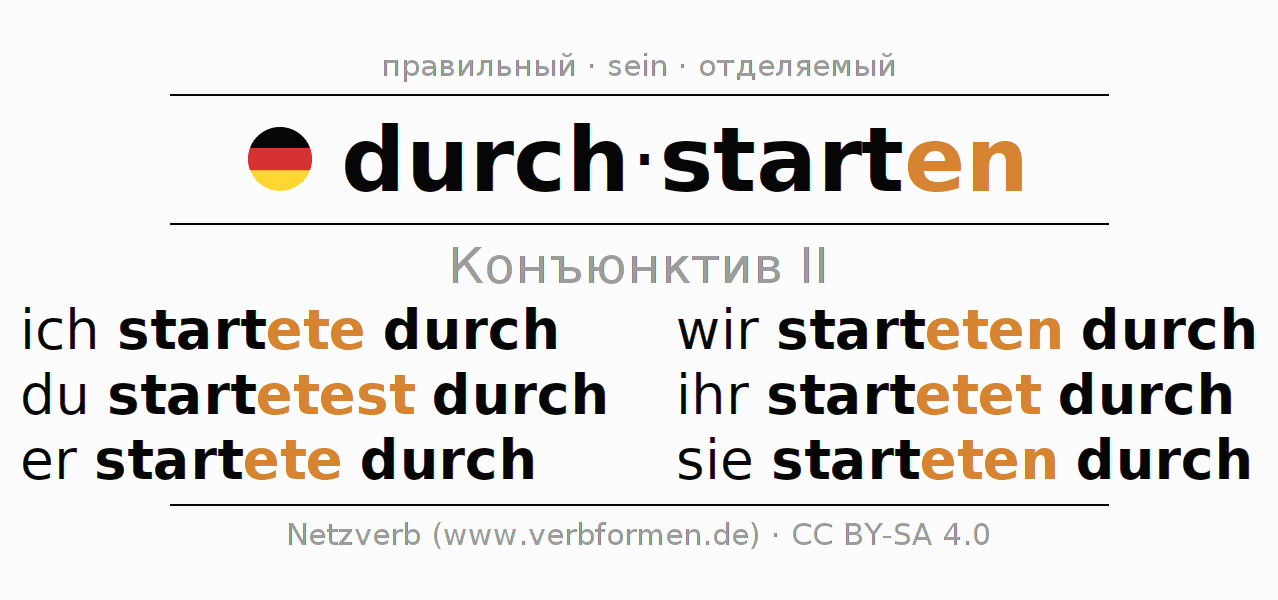 Спряжение durchstarten (взлетать, ускоряться) в сослагательном наклонении II: ich startete durch, du startetest durch, er startete durch, wir starteten durch, ihr startetet durch, sie starteten durch