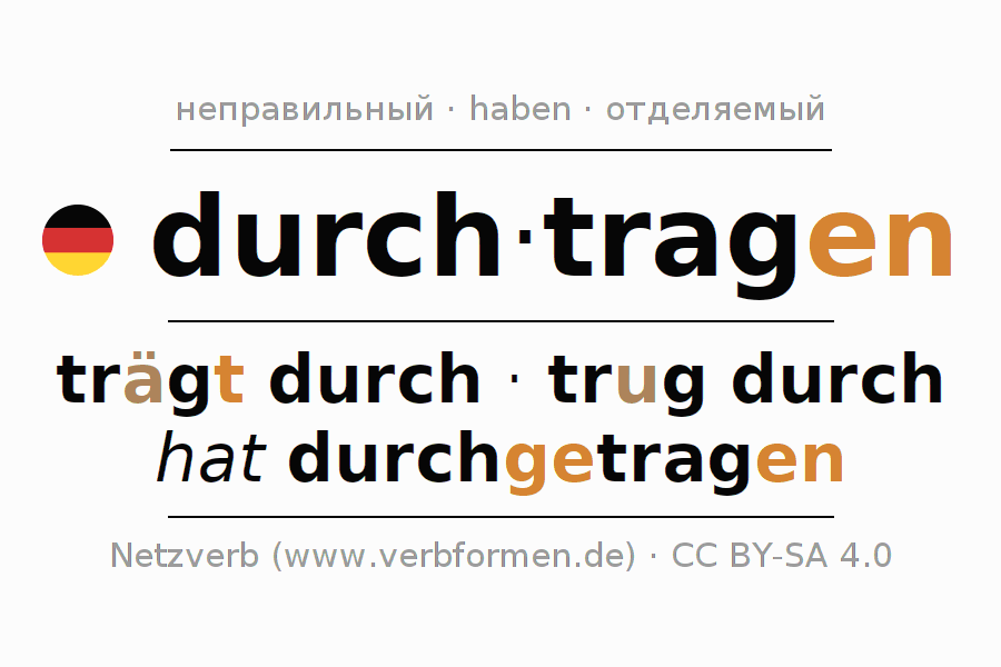 Спряжение durchtragen (переносить, нести) в сослагательном наклонении II: ich trüge durch, du trügest durch, er trüge durch, wir trügen durch, ihr trüget durch, sie trügen durch