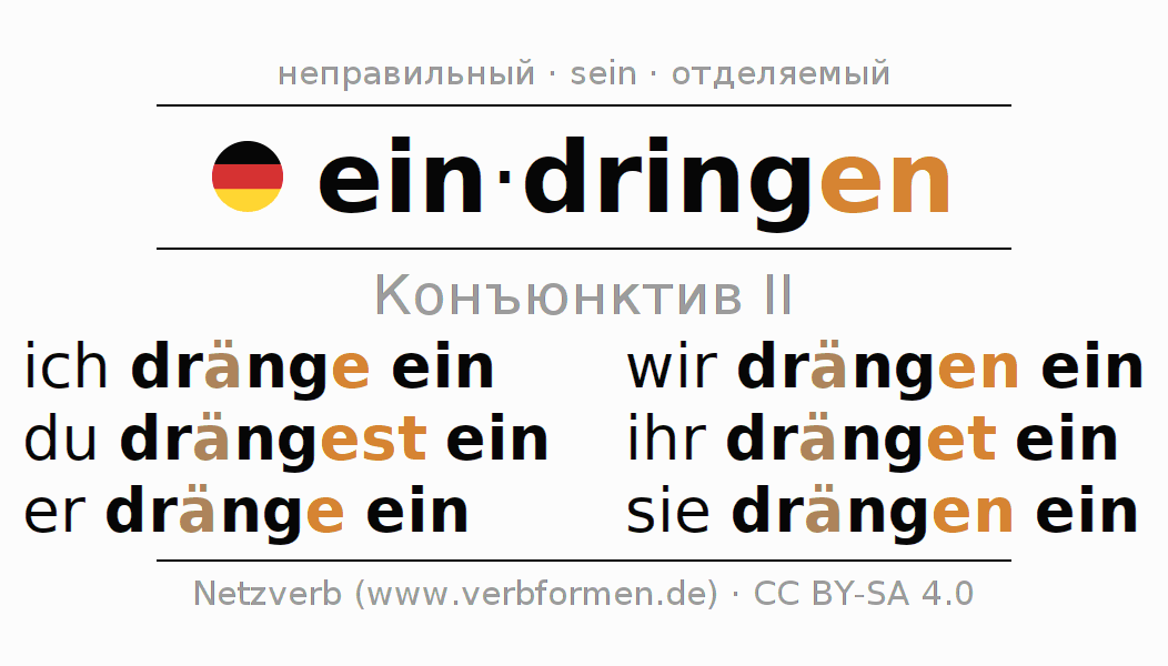 Спряжение eindringen (вторгаться, проникать) в сослагательном наклонении II: ich dränge ein, du drängest ein, er dränge ein, wir drängen ein, ihr dränget ein, sie drängen ein