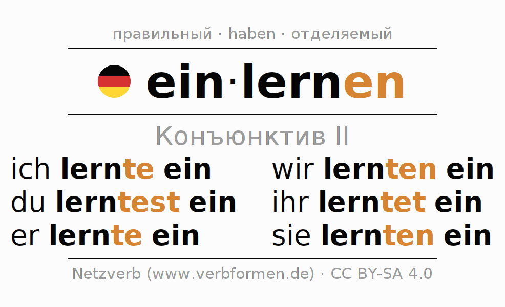 Спряжение einlernen (зазубривать, зазубрить) в сослагательном наклонении II: ich lernte ein, du lerntest ein, er lernte ein, wir lernten ein, ihr lerntet ein, sie lernten ein