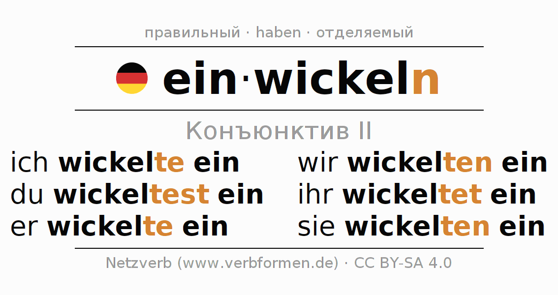 Спряжение einwickeln (завернуть, завернуться) в сослагательном наклонении II: ich wickelte ein, du wickeltest ein, er wickelte ein, wir wickelten ein, ihr wickeltet ein, sie wickelten ein