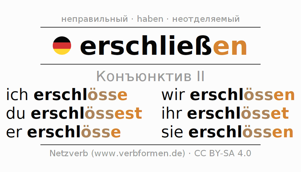 Спряжение erschließen (осваивать, вскрывать) в сослагательном наклонении II: ich erschlösse, du erschlössest, er erschlösse, wir erschlössen, ihr erschlösset, sie erschlössen