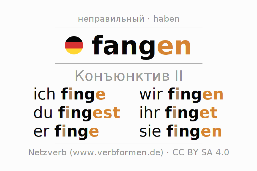 Спряжение fangen (поймать, ловить) в сослагательном наклонении II: ich finge, du fingest, er finge, wir fingen, ihr finget, sie fingen