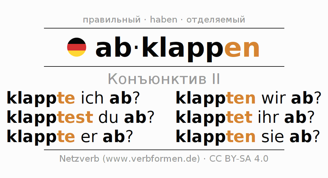Спряжение abklappen в Koнъюнктив Претеритум Сослагательное наклонение Действительный залог (актив): klappte ich ab?, klapptest du ab?, klappte er ab?, klappten wir ab?, klapptet ihr ab?, klappten sie ab?.Образование этих форм происходит по определённым грамматическим правилам. Так же спрягаются простые глагольные формы abklappen в Конъюнктив II. Kомментарии ☆