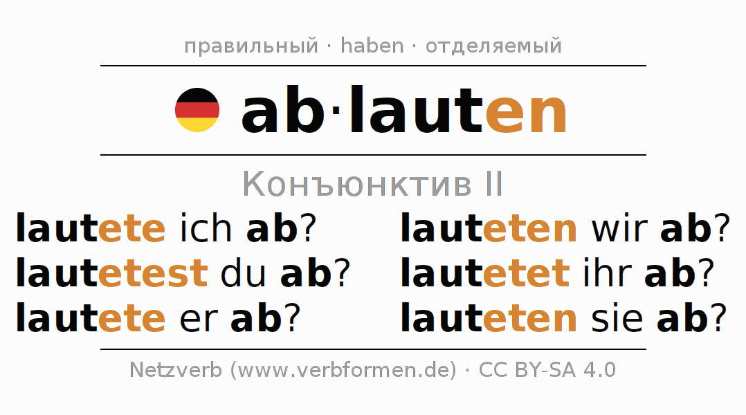 Спряжение ablauten в Koнъюнктив Претеритум Сослагательное наклонение Действительный залог (актив): lautete ich ab?, lautetest du ab?, lautete er ab?, lauteten wir ab?, lautetet ihr ab?, lauteten sie ab?.Образование этих форм происходит по определённым грамматическим правилам. Так же спрягаются простые глагольные формы ablauten в Конъюнктив II. Kомментарии ☆