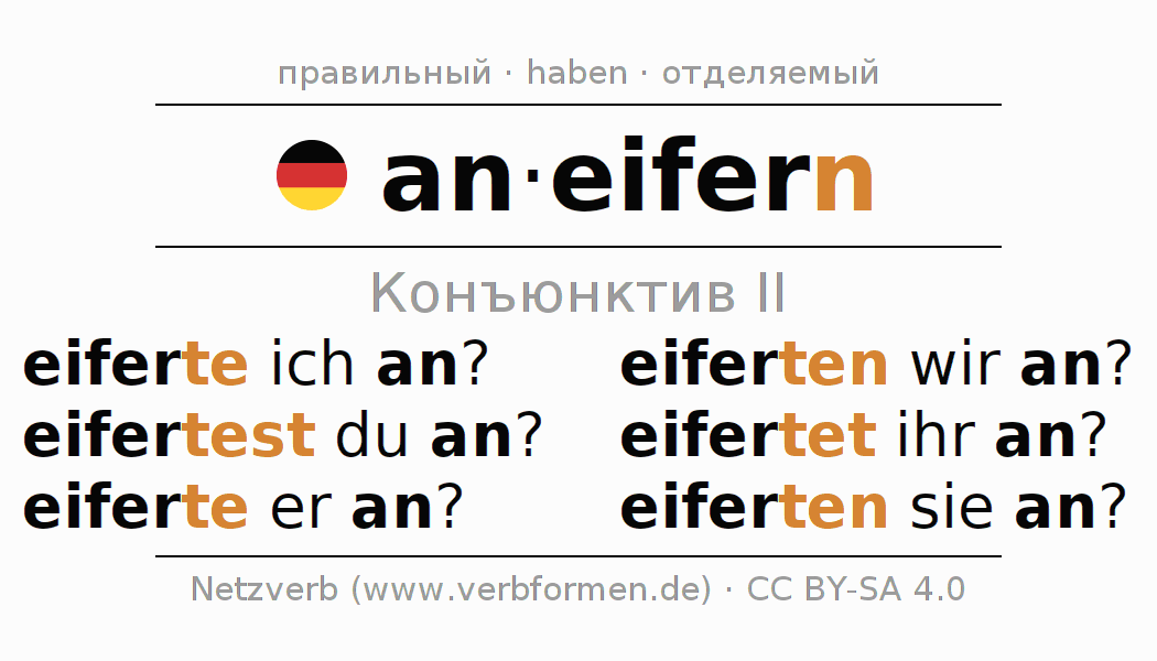 Спряжение aneifern в Koнъюнктив Претеритум Сослагательное наклонение Действительный залог (актив): eiferte ich an?, eifertest du an?, eiferte er an?, eiferten wir an?, eifertet ihr an?, eiferten sie an?.Образование этих форм происходит по определённым грамматическим правилам. Так же спрягаются простые глагольные формы aneifern в Конъюнктив II. Kомментарии ☆