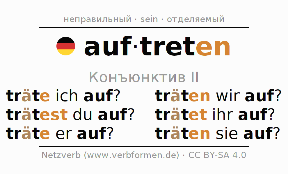 Спряжение auftreten в Koнъюнктив Претеритум Сослагательное наклонение Действительный залог (актив): träte ich auf?, trätest du auf?, träte er auf?, träten wir auf?, trätet ihr auf?, träten sie auf?.Образование этих форм происходит по определённым грамматическим правилам. Так же спрягаются простые глагольные формы auftreten в Конъюнктив II. Kомментарии ☆