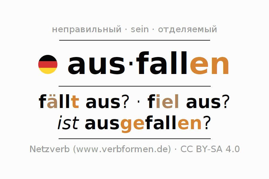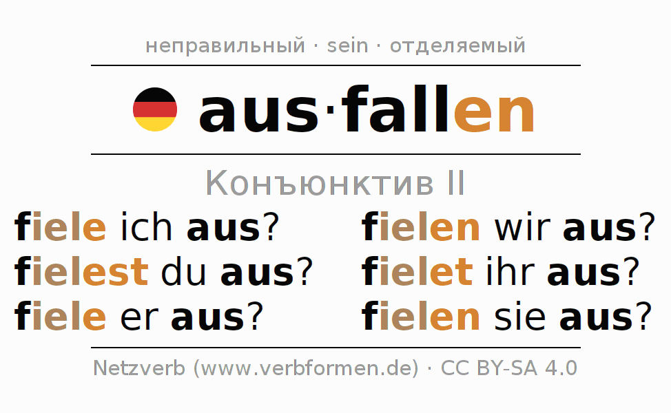 Спряжение ausfallen в Koнъюнктив Претеритум Сослагательное наклонение Действительный залог (актив): fiele ich aus?, fielest du aus?, fiele er aus?, fielen wir aus?, fielet ihr aus?, fielen sie aus?.Образование этих форм происходит по определённым грамматическим правилам. Так же спрягаются простые глагольные формы ausfallen в Конъюнктив II. Kомментарии ☆