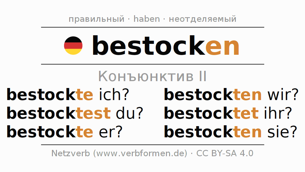 Спряжение bestocken в Koнъюнктив Претеритум Сослагательное наклонение Действительный залог (актив): bestockte ich?, bestocktest du?, bestockte er?, bestockten wir?, bestocktet ihr?, bestockten sie?.Образование этих форм происходит по определённым грамматическим правилам. Так же спрягаются простые глагольные формы bestocken в Конъюнктив II. Kомментарии ☆