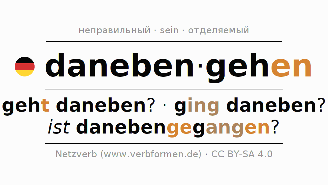 Спряжение danebengehen в Koнъюнктив Претеритум Сослагательное наклонение Действительный залог (актив): ginge ich daneben?, gingest du daneben?, ginge er daneben?, gingen wir daneben?, ginget ihr daneben?, gingen sie daneben?.Образование этих форм происходит по определённым грамматическим правилам. Так же спрягаются простые глагольные формы danebengehen в Конъюнктив II. Kомментарии ☆