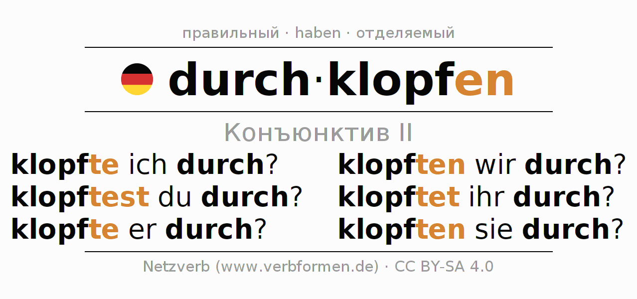 Спряжение durchklopfen в Koнъюнктив Претеритум Сослагательное наклонение Действительный залог (актив): klopfte ich durch?, klopftest du durch?, klopfte er durch?, klopften wir durch?, klopftet ihr durch?, klopften sie durch?.Образование этих форм происходит по определённым грамматическим правилам. Так же спрягаются простые глагольные формы durchklopfen в Конъюнктив II. Kомментарии ☆