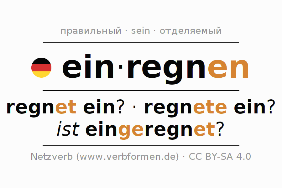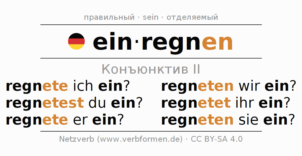 Спряжение einregnen в Koнъюнктив Претеритум Сослагательное наклонение Действительный залог (актив): regnete ich ein?, regnetest du ein?, regnete er ein?, regneten wir ein?, regnetet ihr ein?, regneten sie ein?.Образование этих форм происходит по определённым грамматическим правилам. Так же спрягаются простые глагольные формы einregnen в Конъюнктив II. Kомментарии ☆