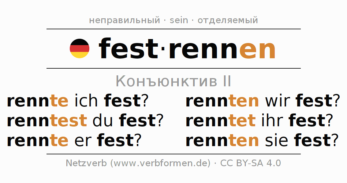 Спряжение festrennen в Koнъюнктив Претеритум Сослагательное наклонение Действительный залог (актив): rennte ich fest?, renntest du fest?, rennte er fest?, rennten wir fest?, renntet ihr fest?, rennten sie fest?.Образование этих форм происходит по определённым грамматическим правилам. Так же спрягаются простые глагольные формы festrennen в Конъюнктив II. Kомментарии ☆