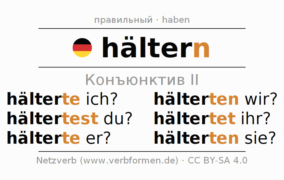 Спряжение hältern в Koнъюнктив Претеритум Сослагательное наклонение Действительный залог (актив): hälterte ich?, hältertest du?, hälterte er?, hälterten wir?, hältertet ihr?, hälterten sie?.Образование этих форм происходит по определённым грамматическим правилам. Так же спрягаются простые глагольные формы hältern в Конъюнктив II. Kомментарии ☆
