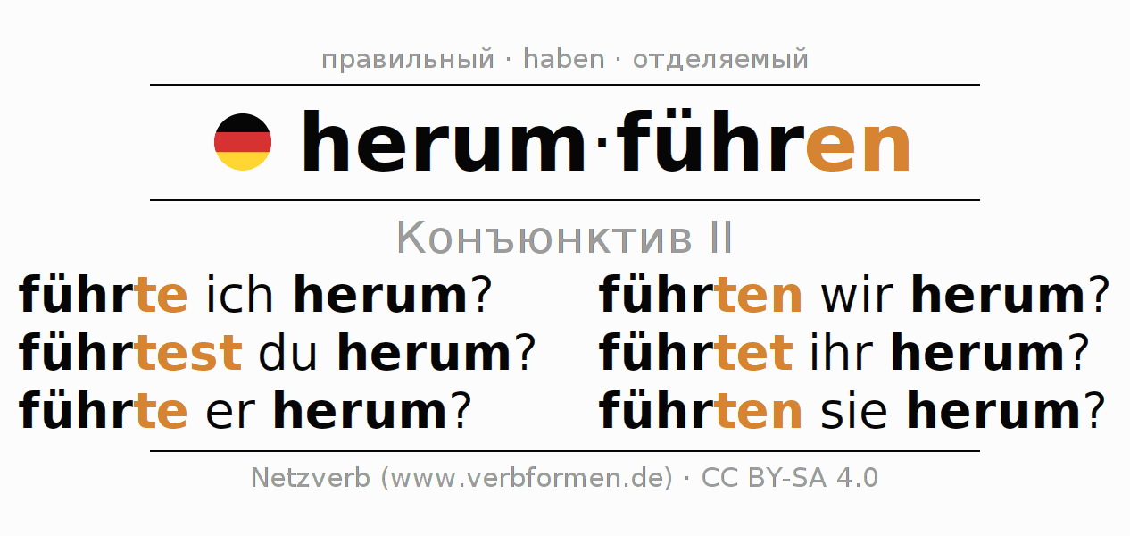 Спряжение herumführen в Koнъюнктив Претеритум Сослагательное наклонение Действительный залог (актив): führte ich herum?, führtest du herum?, führte er herum?, führten wir herum?, führtet ihr herum?, führten sie herum?.Образование этих форм происходит по определённым грамматическим правилам. Так же спрягаются простые глагольные формы herumführen в Конъюнктив II. Kомментарии ☆