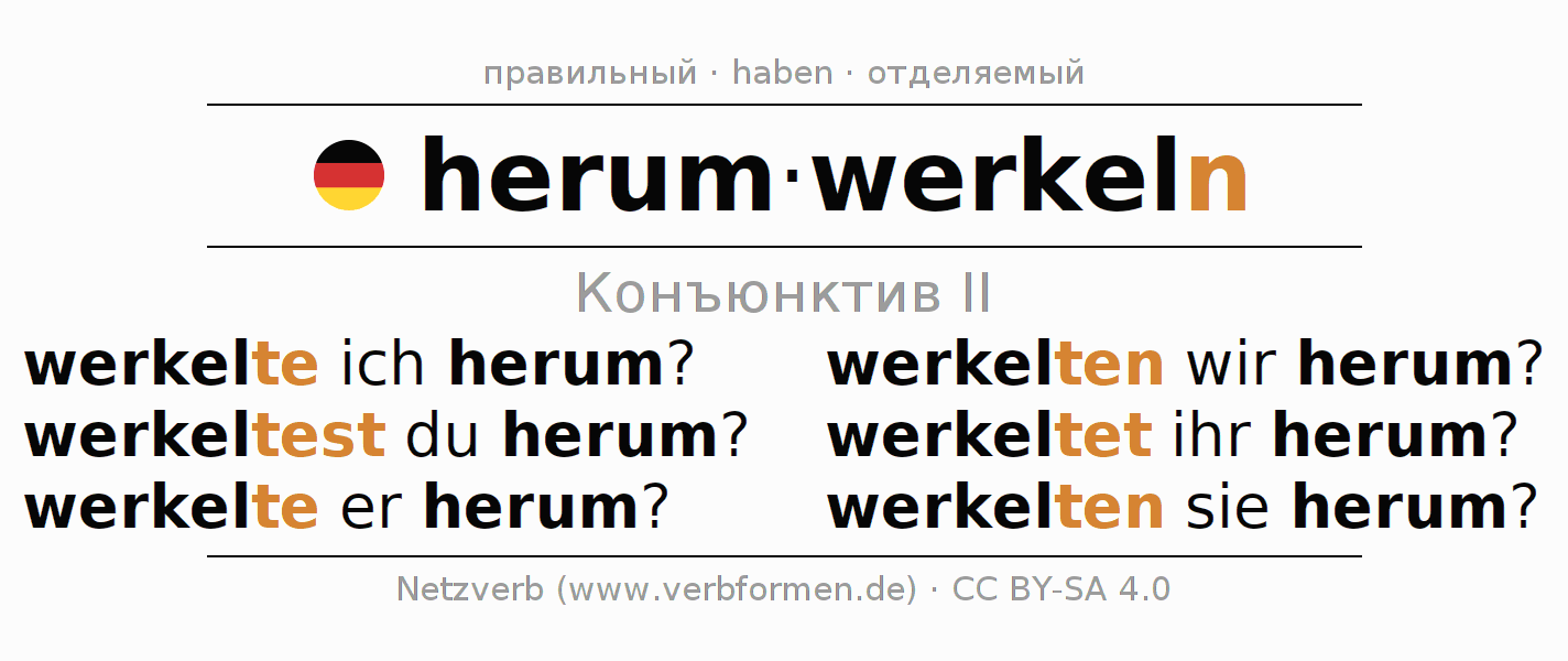 Спряжение herumwerkeln в Koнъюнктив Претеритум Сослагательное наклонение Действительный залог (актив): werkelte ich herum?, werkeltest du herum?, werkelte er herum?, werkelten wir herum?, werkeltet ihr herum?, werkelten sie herum?.Образование этих форм происходит по определённым грамматическим правилам. Так же спрягаются простые глагольные формы herumwerkeln в Конъюнктив II. Kомментарии ☆