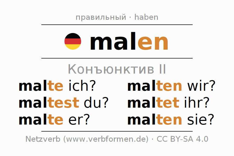 Спряжение malen в Koнъюнктив Претеритум Сослагательное наклонение Действительный залог (актив): malte ich?, maltest du?, malte er?, malten wir?, maltet ihr?, malten sie?.Образование этих форм происходит по определённым грамматическим правилам. Так же спрягаются простые глагольные формы malen в Конъюнктив II. 1Комментарий ☆