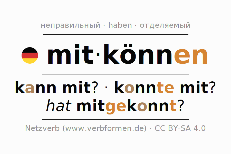 Спряжение mitkönnen в Koнъюнктив Претеритум Сослагательное наклонение Действительный залог (актив): könnte ich mit?, könntest du mit?, könnte er mit?, könnten wir mit?, könntet ihr mit?, könnten sie mit?.Образование этих форм происходит по определённым грамматическим правилам. Так же спрягаются простые глагольные формы mitkönnen в Конъюнктив II. Kомментарии ☆