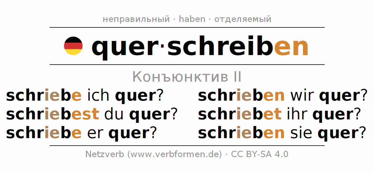 Спряжение querschreiben в Koнъюнктив Претеритум Сослагательное наклонение Действительный залог (актив): schriebe ich quer?, schriebest du quer?, schriebe er quer?, schrieben wir quer?, schriebet ihr quer?, schrieben sie quer?.Образование этих форм происходит по определённым грамматическим правилам. Так же спрягаются простые глагольные формы querschreiben в Конъюнктив II. Kомментарии ☆
