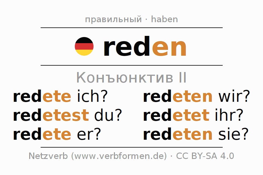 Спряжение reden в Koнъюнктив Претеритум Сослагательное наклонение Действительный залог (актив): redete ich?, redetest du?, redete er?, redeten wir?, redetet ihr?, redeten sie?.Образование этих форм происходит по определённым грамматическим правилам. Так же спрягаются простые глагольные формы reden в Конъюнктив II. Kомментарии ☆