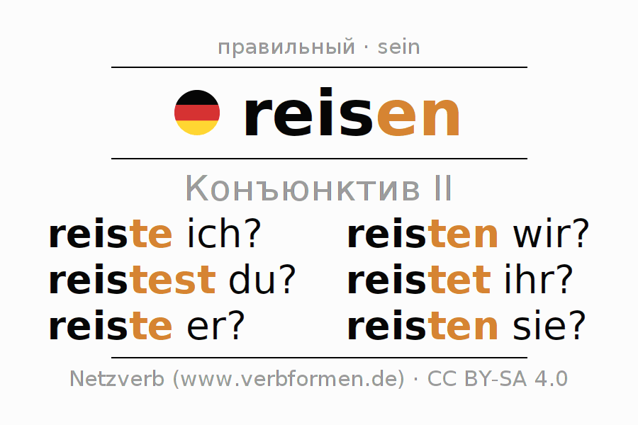 Спряжение reisen в Koнъюнктив Претеритум Сослагательное наклонение Действительный залог (актив): reiste ich?, reistest du?, reiste er?, reisten wir?, reistet ihr?, reisten sie?.Образование этих форм происходит по определённым грамматическим правилам. Так же спрягаются простые глагольные формы reisen в Конъюнктив II. Kомментарии ☆