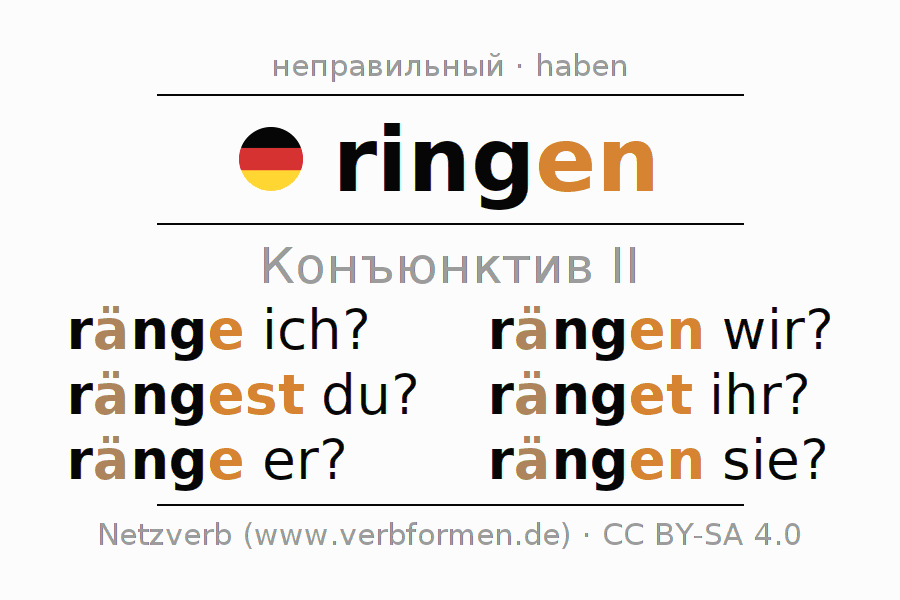 Спряжение ringen в Koнъюнктив Претеритум Сослагательное наклонение Действительный залог (актив): ränge ich?, rängest du?, ränge er?, rängen wir?, ränget ihr?, rängen sie?.Образование этих форм происходит по определённым грамматическим правилам. Так же спрягаются простые глагольные формы ringen в Конъюнктив II. Kомментарии ☆