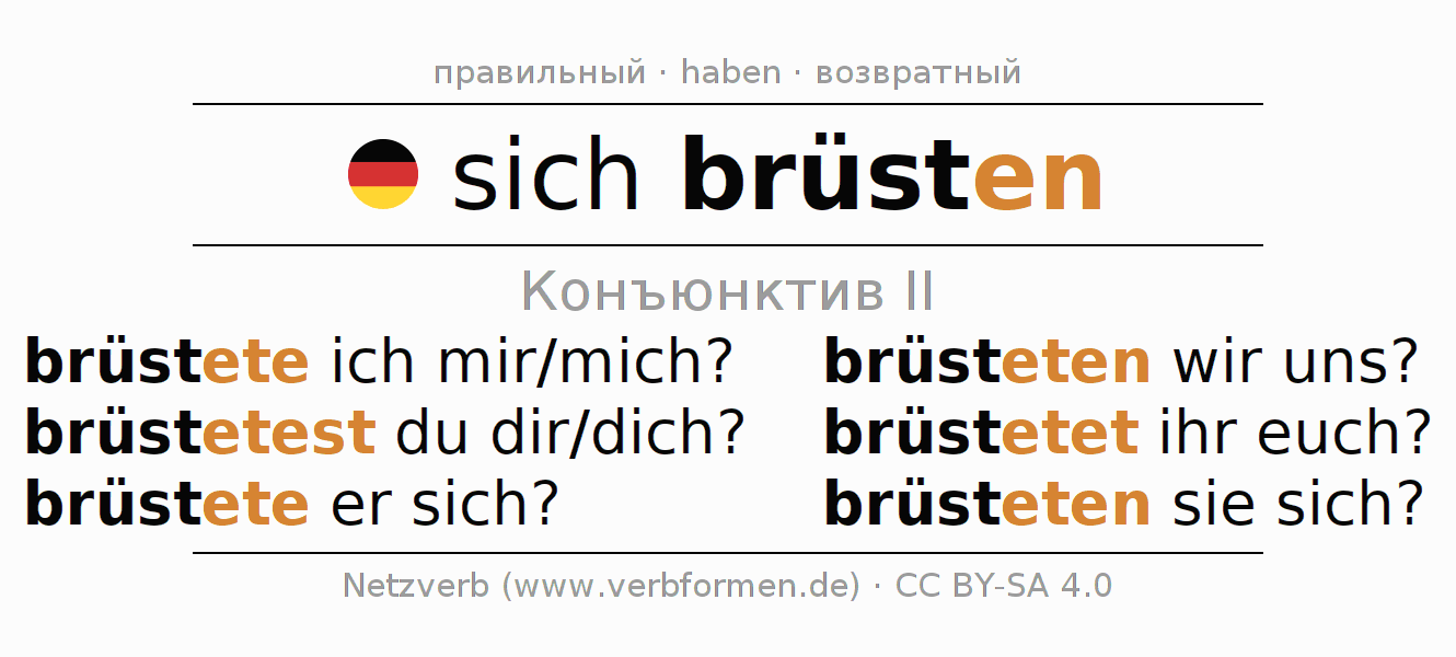 Спряжение sich brüsten в Koнъюнктив Претеритум Сослагательное наклонение Действительный залог (актив): brüstete ich mir/mich?, brüstetest du dir/dich?, brüstete er sich?, brüsteten wir uns?, brüstetet ihr euch?, brüsteten sie sich?.Образование этих форм происходит по определённым грамматическим правилам. Так же спрягаются простые глагольные формы brüsten в Конъюнктив II. Kомментарии ☆
