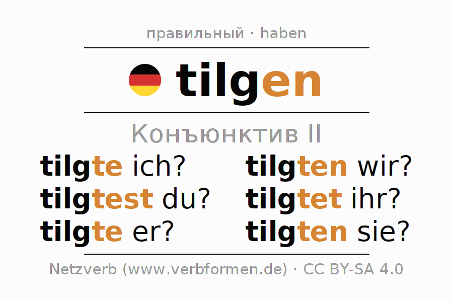 Спряжение tilgen в Koнъюнктив Претеритум Сослагательное наклонение Действительный залог (актив): tilgte ich?, tilgtest du?, tilgte er?, tilgten wir?, tilgtet ihr?, tilgten sie?.Образование этих форм происходит по определённым грамматическим правилам. Так же спрягаются простые глагольные формы tilgen в Конъюнктив II. Kомментарии ☆