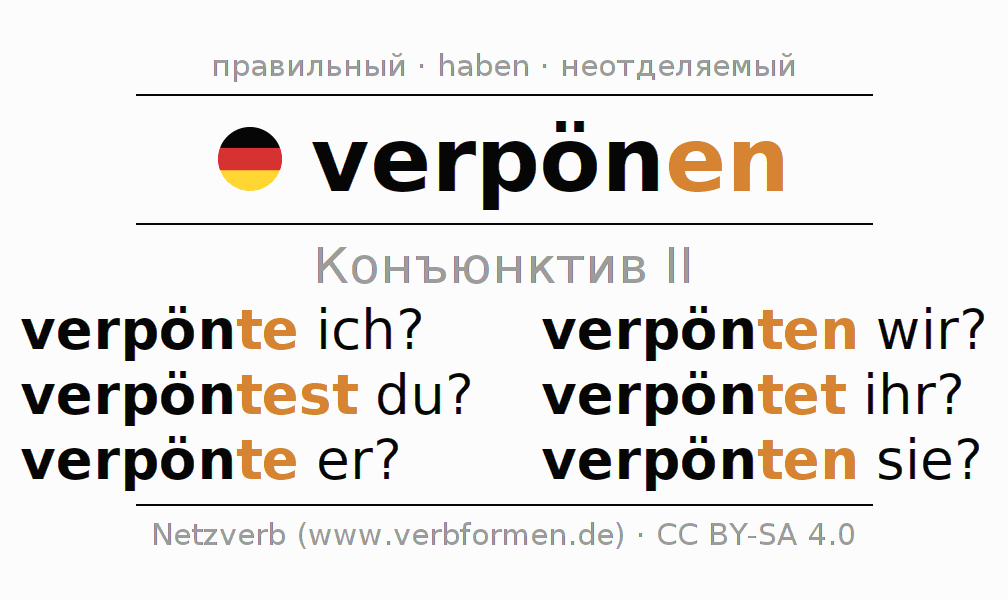 Спряжение verpönen в Koнъюнктив Претеритум Сослагательное наклонение Действительный залог (актив): verpönte ich?, verpöntest du?, verpönte er?, verpönten wir?, verpöntet ihr?, verpönten sie?.Образование этих форм происходит по определённым грамматическим правилам. Так же спрягаются простые глагольные формы verpönen в Конъюнктив II. Kомментарии ☆