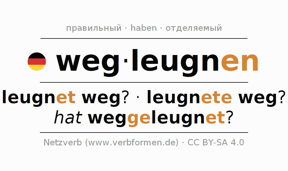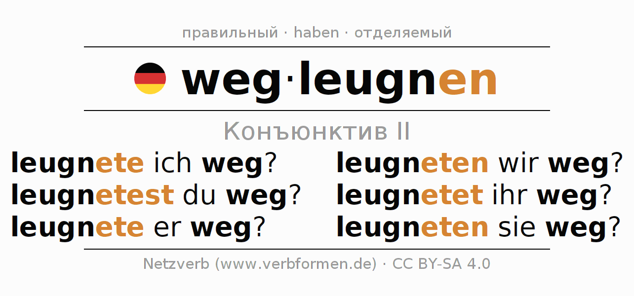 Спряжение wegleugnen в Koнъюнктив Претеритум Сослагательное наклонение Действительный залог (актив): leugnete ich weg?, leugnetest du weg?, leugnete er weg?, leugneten wir weg?, leugnetet ihr weg?, leugneten sie weg?.Образование этих форм происходит по определённым грамматическим правилам. Так же спрягаются простые глагольные формы wegleugnen в Конъюнктив II. Kомментарии ☆