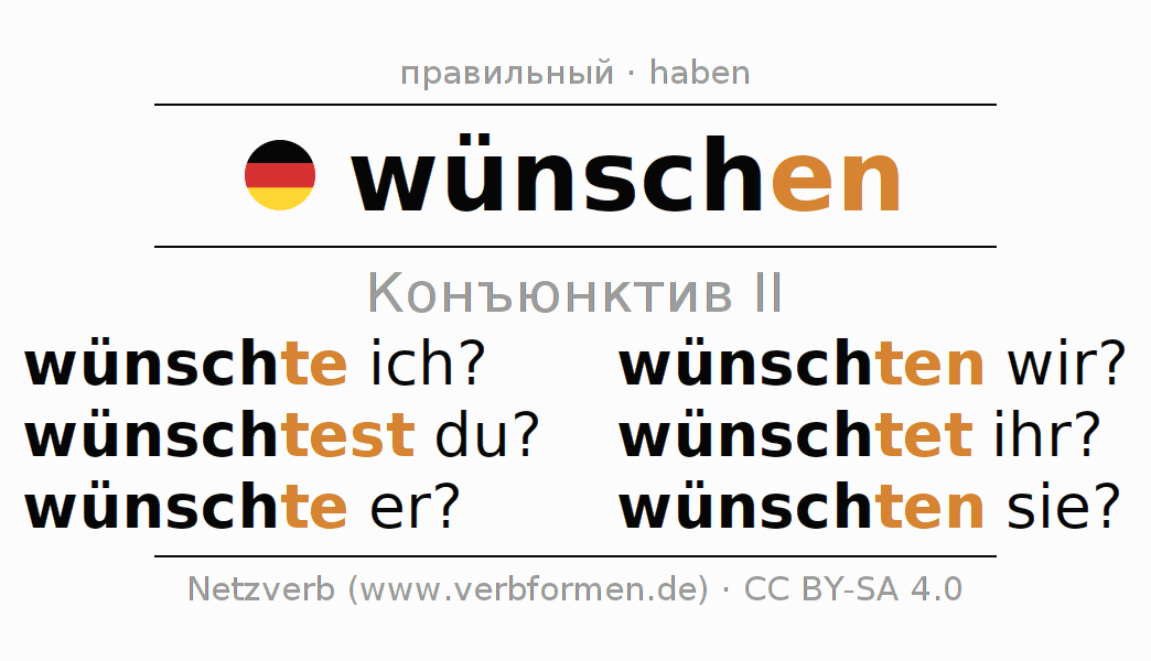 Спряжение wünschen в Koнъюнктив Претеритум Сослагательное наклонение Действительный залог (актив): wünschte ich?, wünschtest du?, wünschte er?, wünschten wir?, wünschtet ihr?, wünschten sie?.Образование этих форм происходит по определённым грамматическим правилам. Так же спрягаются простые глагольные формы wünschen в Конъюнктив II. Kомментарии ☆
