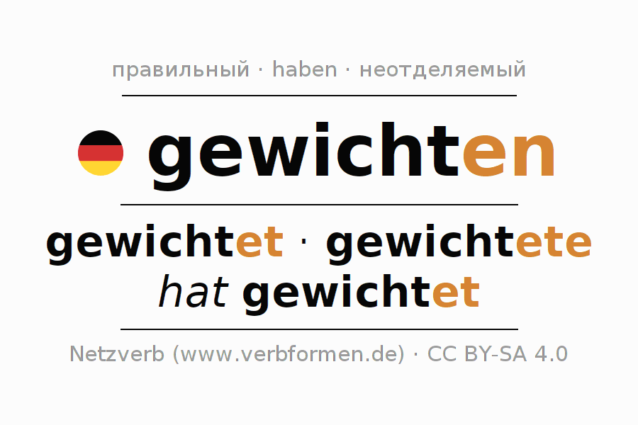 Спряжение gewichten (весить, вес) в сослагательном наклонении II: ich gewichtete, du gewichtetest, er gewichtete, wir gewichteten, ihr gewichtetet, sie gewichteten