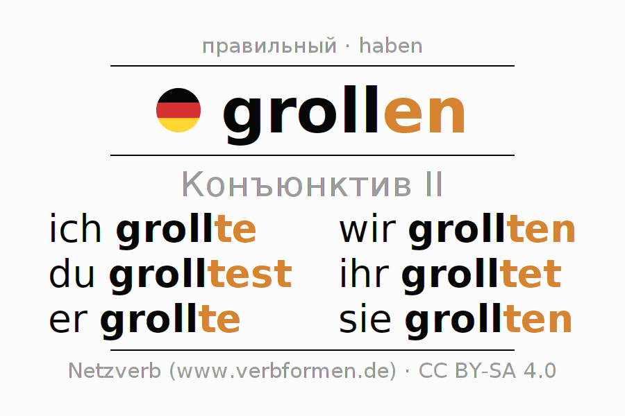 Спряжение grollen (громыхать, греметь) в сослагательном наклонении II: ich grollte, du grolltest, er grollte, wir grollten, ihr grolltet, sie grollten