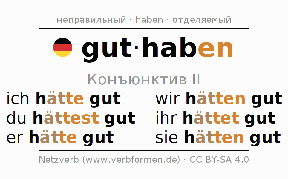 Спряжение guthaben (иметь кредит, кредит) в сослагательном наклонении II: ich hätte gut, du hättest gut, er hätte gut, wir hätten gut, ihr hättet gut, sie hätten gut