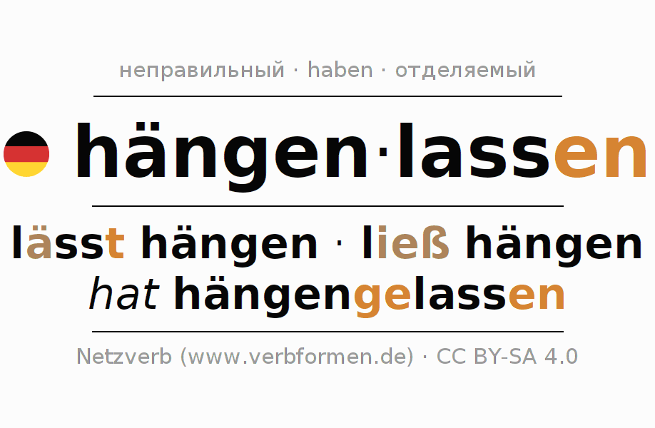 Спряжение hängenlassen (подводить, подкачивать) в сослагательном наклонении II: ich ließe hängen, du ließest hängen, er ließe hängen, wir ließen hängen, ihr ließet hängen, sie ließen hängen