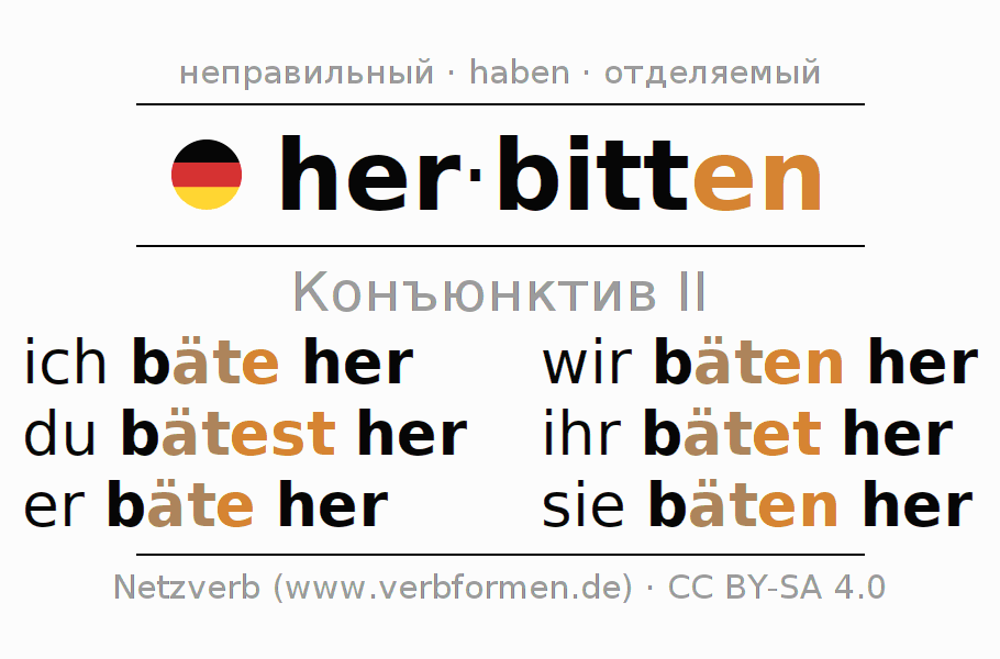 Спряжение herbitten (пригласить к себе) в сослагательном наклонении II: ich bäte her, du bätest her, er bäte her, wir bäten her, ihr bätet her, sie bäten her