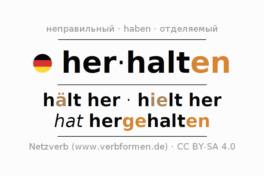 Спряжение herhalten (отвечать, подставить) в сослагательном наклонении II: ich hielte her, du hieltest her, er hielte her, wir hielten her, ihr hieltet her, sie hielten her