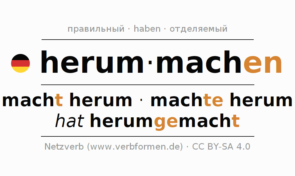 Спряжение herummachen (заниматься, заниматься сексом) в сослагательном наклонении II: ich machte herum, du machtest herum, er machte herum, wir machten herum, ihr machtet herum, sie machten herum