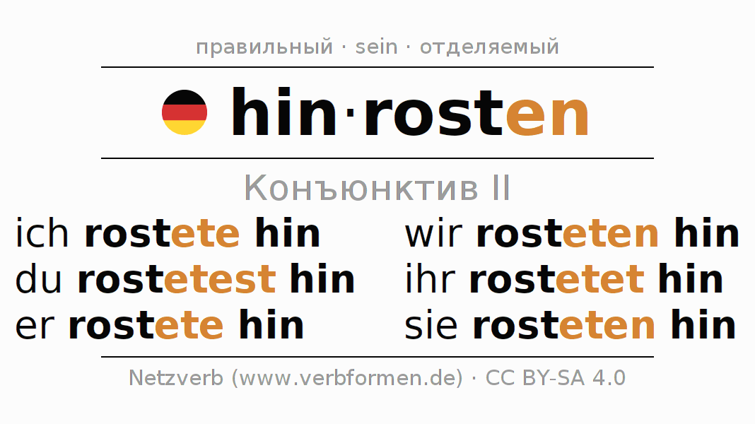 Спряжение hinrosten (разрушаться, ржаветь) в сослагательном наклонении II: ich rostete hin, du rostetest hin, er rostete hin, wir rosteten hin, ihr rostetet hin, sie rosteten hin