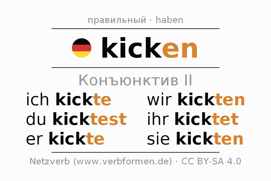 Спряжение kicken (пнуть, играть в футбол) в сослагательном наклонении II: ich kickte, du kicktest, er kickte, wir kickten, ihr kicktet, sie kickten