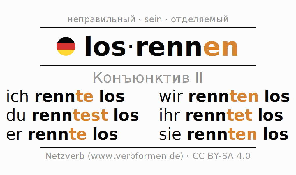 Спряжение losrennen (бежать, бросаться бежать) в сослагательном наклонении II: ich rennte los, du renntest los, er rennte los, wir rennten los, ihr renntet los, sie rennten los