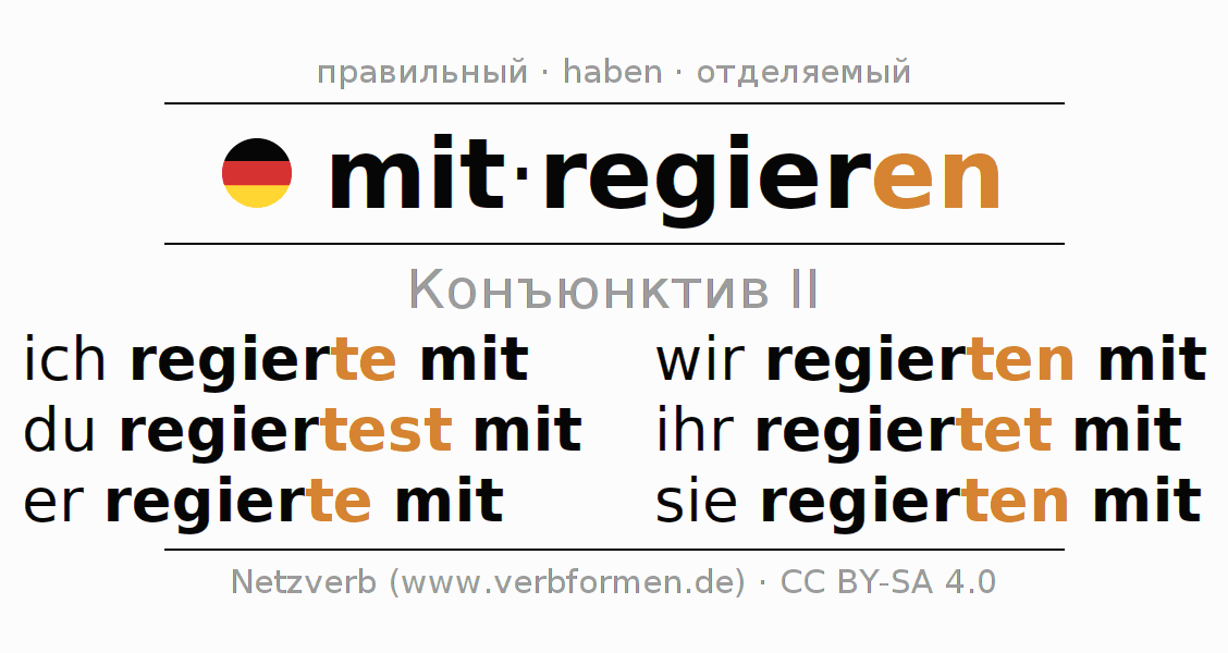 Спряжение mitregieren (участвовать в управлении) в сослагательном наклонении II: ich regierte mit, du regiertest mit, er regierte mit, wir regierten mit, ihr regiertet mit, sie regierten mit