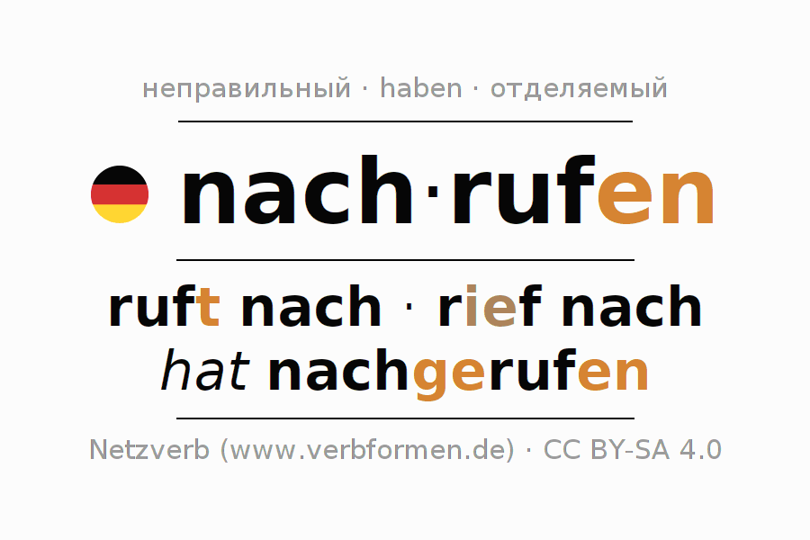 Спряжение nachrufen (крикнуть, позвать) в сослагательном наклонении II: ich riefe nach, du riefest nach, er riefe nach, wir riefen nach, ihr riefet nach, sie riefen nach