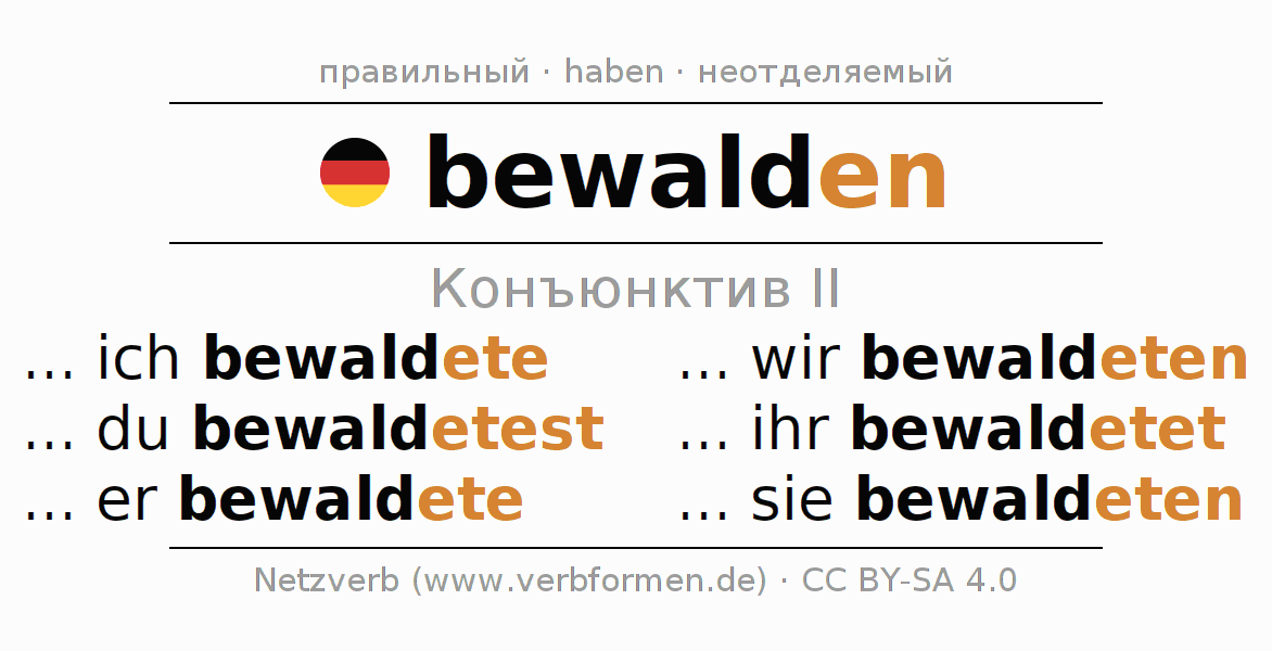 Спряжение bewalden в Koнъюнктив Претеритум Сослагательное наклонение Действительный залог (актив): ... ich bewaldete, ... du bewaldetest, ... er bewaldete, ... wir bewaldeten, ... ihr bewaldetet, ... sie bewaldeten.Образование этих форм происходит по определённым грамматическим правилам. Так же спрягаются простые глагольные формы bewalden в Конъюнктив II. Kомментарии ☆