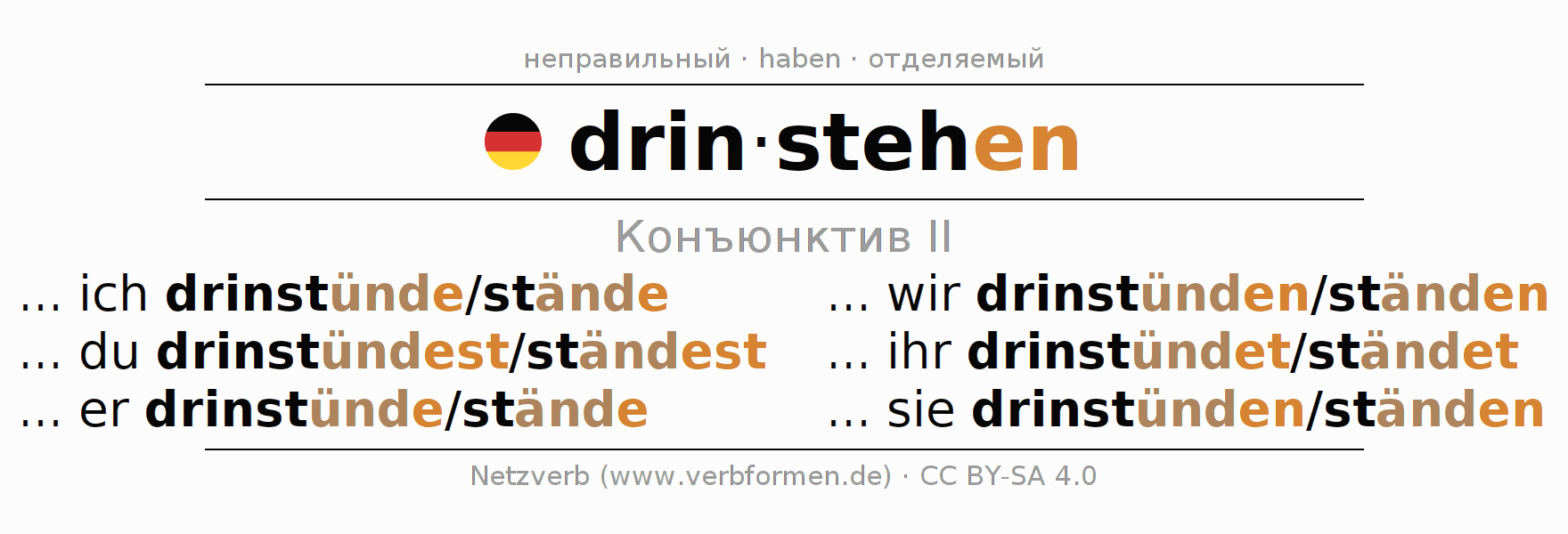 Спряжение drinstehen в Koнъюнктив Претеритум Сослагательное наклонение Действительный залог (актив): ... ich drinstünde/stände, ... du drinstündest/ständest, ... er drinstünde/stände, ... wir drinstünden/ständen, ... ihr drinstündet/ständet, ... sie drinstünden/ständen.Образование этих форм происходит по определённым грамматическим правилам. Так же спрягаются простые глагольные формы drinstehen в Конъюнктив II. Kомментарии ☆
