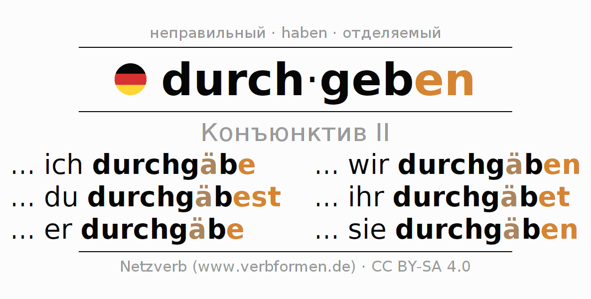 Спряжение durchgeben в Koнъюнктив Претеритум Сослагательное наклонение Действительный залог (актив): ... ich durchgäbe, ... du durchgäbest, ... er durchgäbe, ... wir durchgäben, ... ihr durchgäbet, ... sie durchgäben.Образование этих форм происходит по определённым грамматическим правилам. Так же спрягаются простые глагольные формы durchgeben в Конъюнктив II. Kомментарии ☆