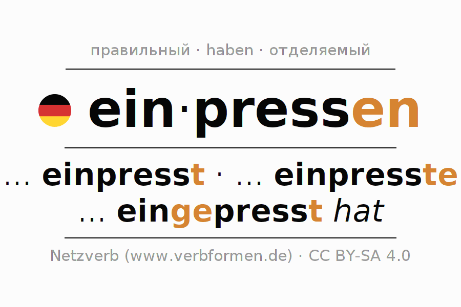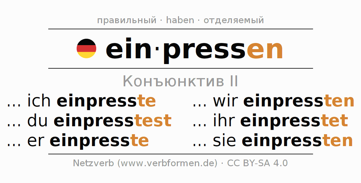 Спряжение einpressen в Koнъюнктив Претеритум Сослагательное наклонение Действительный залог (актив): ... ich einpresste, ... du einpresstest, ... er einpresste, ... wir einpressten, ... ihr einpresstet, ... sie einpressten.Образование этих форм происходит по определённым грамматическим правилам. Так же спрягаются простые глагольные формы einpressen в Конъюнктив II. Kомментарии ☆