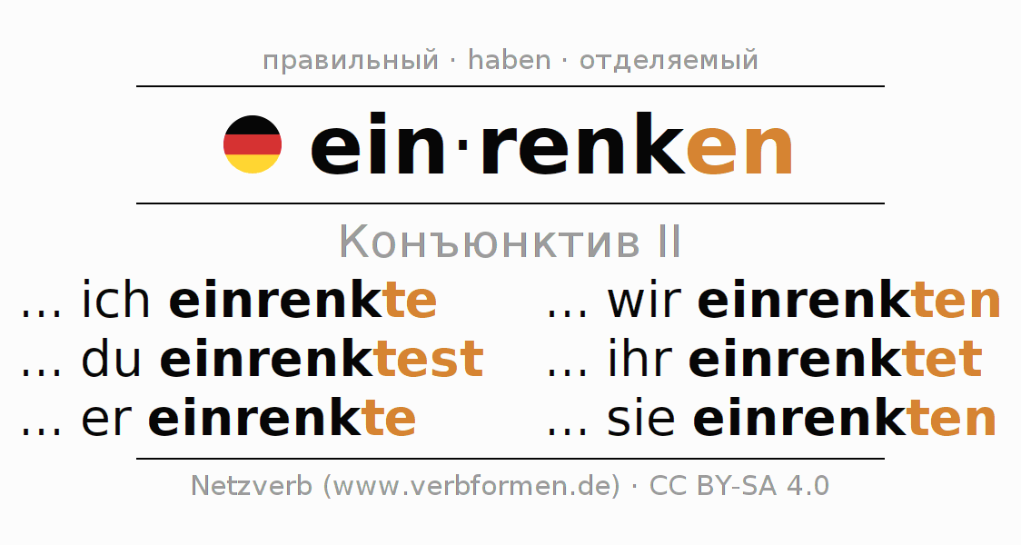 Спряжение einrenken в Koнъюнктив Претеритум Сослагательное наклонение Действительный залог (актив): ... ich einrenkte, ... du einrenktest, ... er einrenkte, ... wir einrenkten, ... ihr einrenktet, ... sie einrenkten.Образование этих форм происходит по определённым грамматическим правилам. Так же спрягаются простые глагольные формы einrenken в Конъюнктив II. Kомментарии ☆