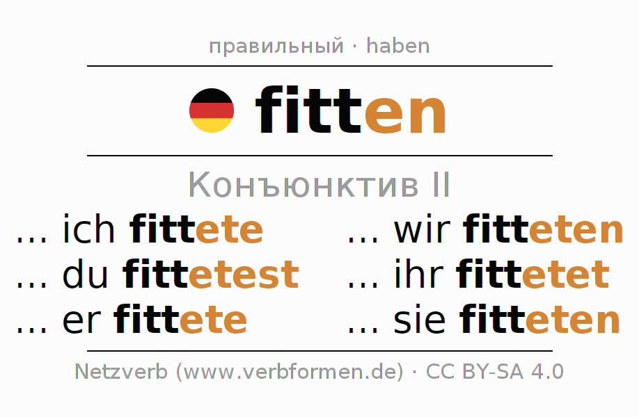 Спряжение fitten в Koнъюнктив Претеритум Сослагательное наклонение Действительный залог (актив): ... ich fittete, ... du fittetest, ... er fittete, ... wir fitteten, ... ihr fittetet, ... sie fitteten.Образование этих форм происходит по определённым грамматическим правилам. Так же спрягаются простые глагольные формы fitten в Конъюнктив II. Kомментарии ☆